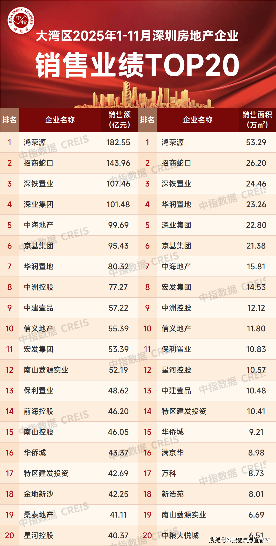 极端声明:房地产企业发售数据统计是以2025年1月1日—11月30日时刻发售的商品房为统计口径,重要根据中指数据CREIS(点击查看)正在深圳市(含深汕互帮区)的发售监测数据,对付监测不全的项目数据,由企业供给干系文献并厉肃审核,也纳入统计周围。本告诉仅供参考,我方过错运用告诉及其实质所激励的任何直接或间接耗费担负仔肩。
