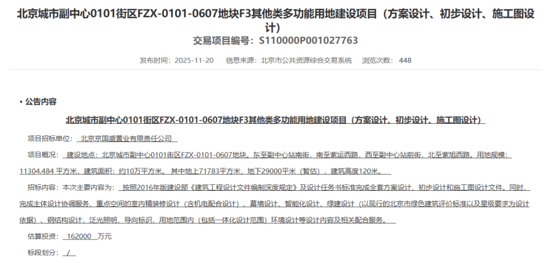 不久前,联系网站揭橥了“北京都会副核心0101街区FZX-0101-0607地块F3其他类多性能用地作战项目(计划策画、开端策画、施工图策画)”招标策动布告。